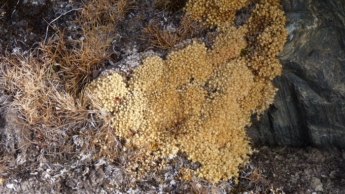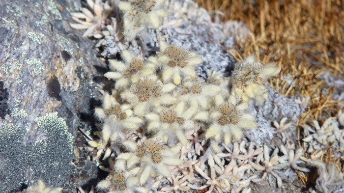 Прогуливаемся по боковой морене, сплошь усеянной кустиками эдельвейсов и жёлтыми лишайниками.