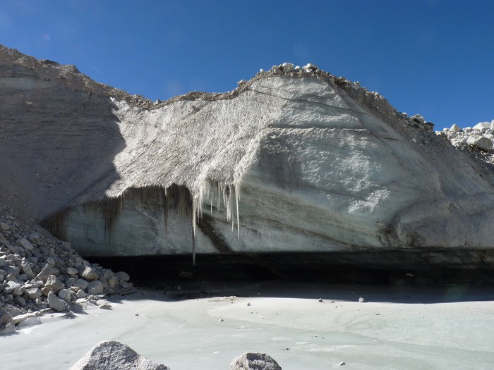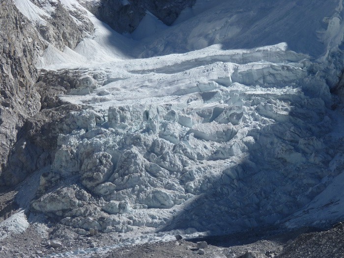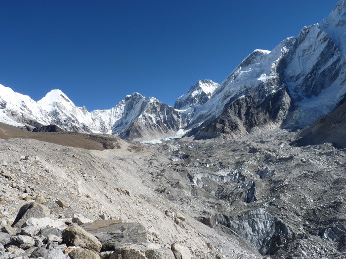 Среди огромных камней и ледяных сераков тропинка вьётся вдоль ледника Кхумбу.