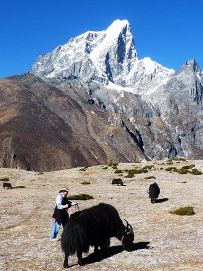 На обдуваемых всеми ветрами пастбищах пасутся чёрные и белые яки, довольно миролюбивые животные. Некоторым из них удалось почесать чёлку.