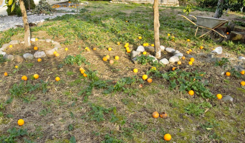 Нам осталось только собрать апельсины, мандарины, грейпфруты. Урожай был очень богатый, цены упали и люди не смогли всё продать, плоды висят на деревьях. Вот крупные апельсины-вашингтоны рядом с семейным кладбищем в саду: