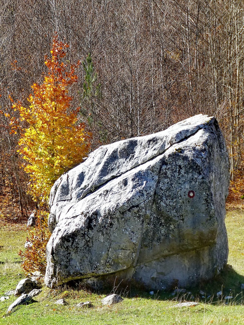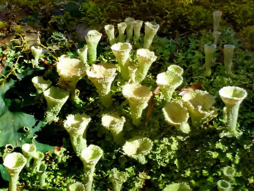 Выше на скалах и огромных валунах под яркими лучами осеннего солнца прекрасно себя чувствует лишайник.