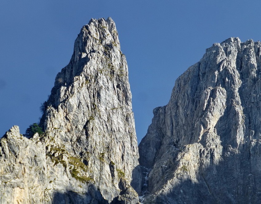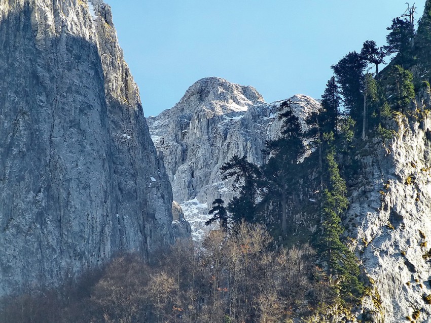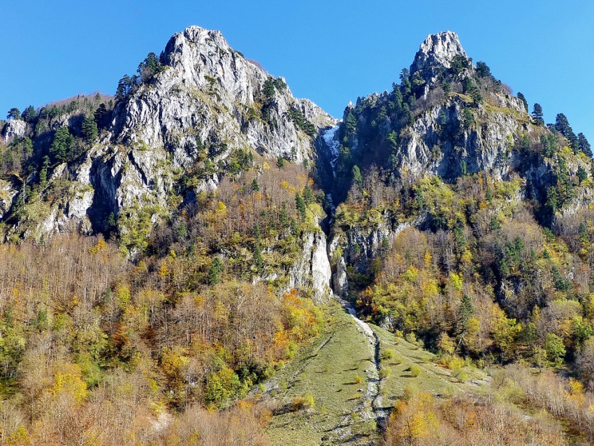 Тем временем, дорожка привела нас к поляне, посреди которой стояла лавочка, обращённая к скалистому хребту. «Не случайно поставили здесь лавку» — подумали мы и присели на неё, рассматривая вершины. И в один голос ахнули! Там вдали под вершиной стояли ворота в небо.