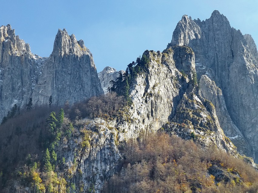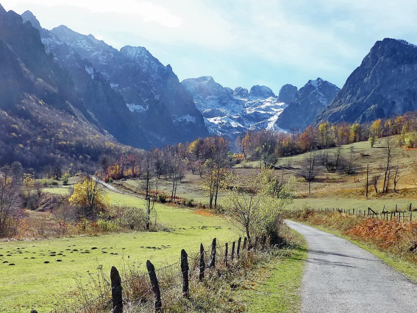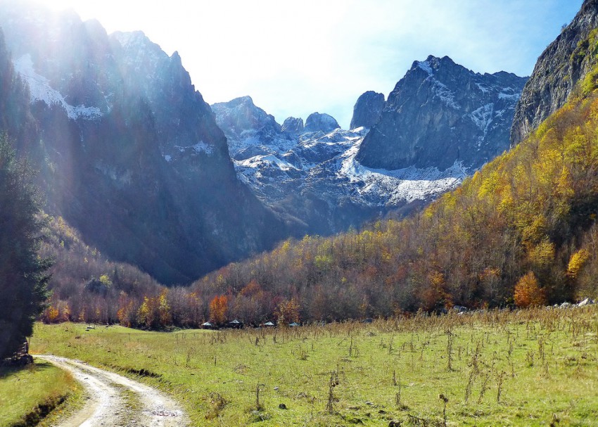 От восторга увиденных из окна машины вершин, мы выбегаем на грунтовую дорогу и идём пешком, любуясь окружающей сказочной красотой долины Грбая.
