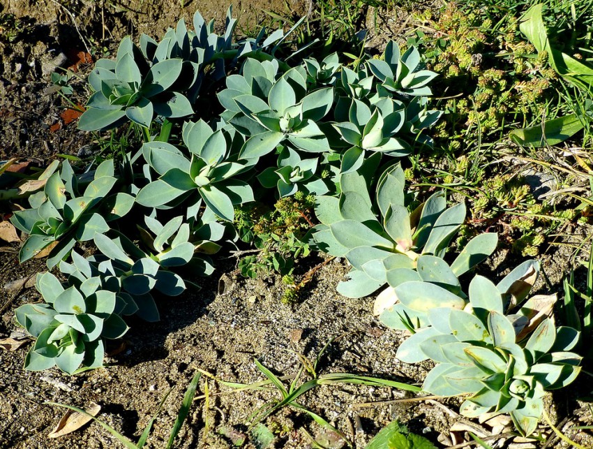 На полянках растут кустики молочая. Они словно приготовились к зиме — распластались по земле, чтобы снег не сломал их хрупкие стебельки.