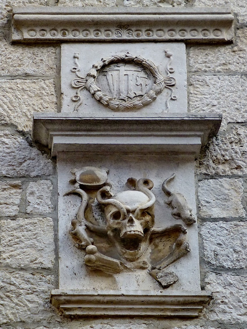 Позади церкви Святой Марии находится дворец Грубоня. На его стене заметен рельеф с черепом и костями, змеями, выползающими из глазниц, и мышью, крысой и черепахой, ползающими рядом с черепом. Этот средневековый символ с XIV века принадлежал которским фармацевтам.