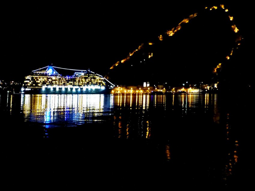 Когда закат погас на лайнере засияли разноцветные огоньки и крепость осветилась яркими прожекторами.
