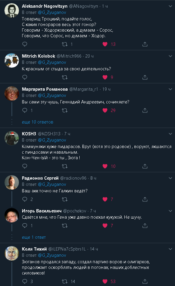Вот кусочек реакции читателей на твит Зюги (кусочек. Лень скринить было, а там где-то 500 ответов ему и 99 % в таком же духе)