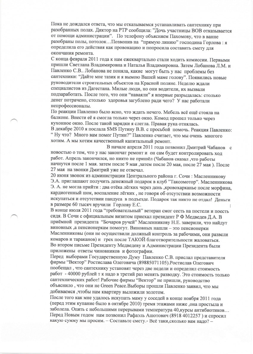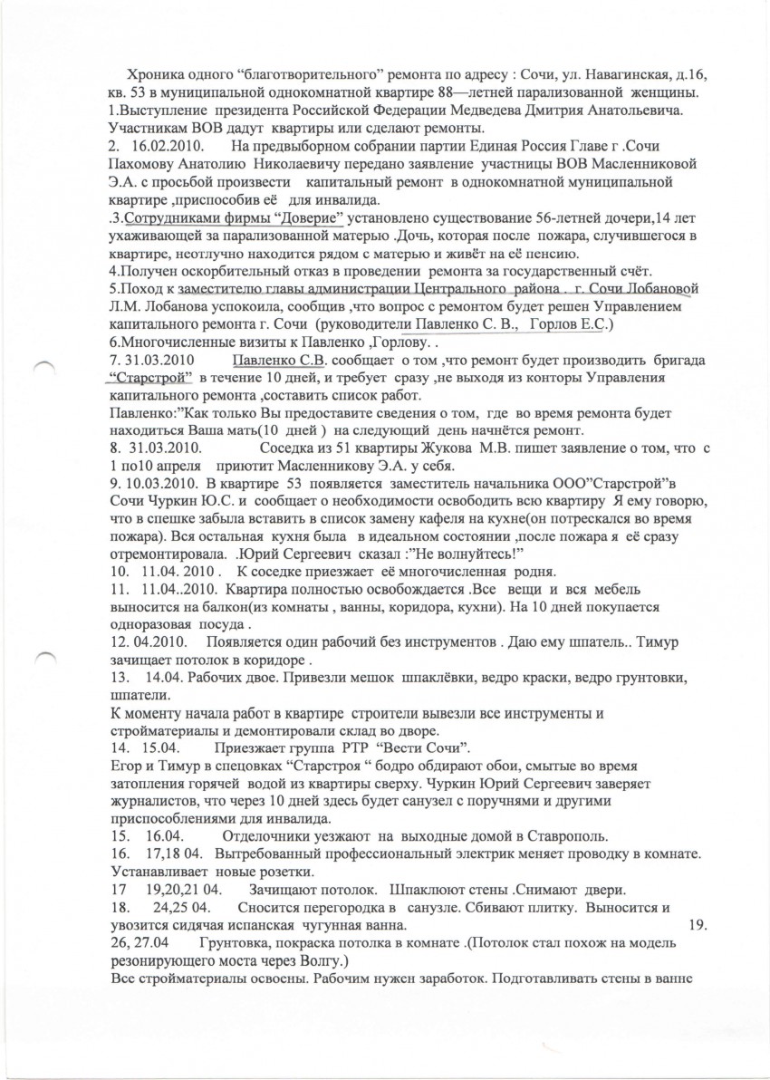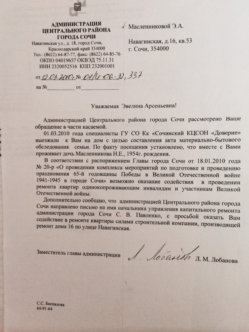 Худо-бедно, своими силами и силами бывших учеников, которые не забывают своего учителя, кухню привели в более-менее нормальный вид. Но на остальное финансовых возможностей катастрофически не хватало. В 2010году президент России Д.А.Медведев в своём выступлении сказал, что ко Дню Победы ветеранам Великой Отечественной войны выдадут либо квартиры (у кого нет), либо сделают ремонт, кроме того, в нашем славном городе приближались выборы в Городское Собрание. И наивные женщины решили обратиться к главе города — Анатолию Николаевичу Пахомову с просьбой сделать ремонт в муниципальной квартире.