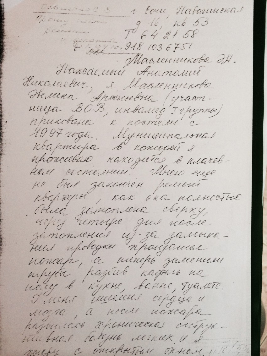 В 2007году соседи сверху залили квартиру (напоминаю — квартира МУНИЦИПАЛЬНАЯ!), вследствие чего произошло короткое замыкание и загорелся холодильник. В то время дочь Эвелины Арсентьевны ещё работала, разрываясь между занятиями в школе и парализованной матерью. На суды уже не оставалось ни времени, ни сил. Но документы в администрацию города были предоставлены, однако, мер к возмещению убытков предпринято не было…