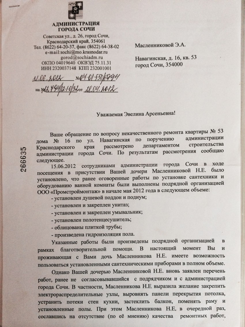 Ну вот почти и всё… По логике администрации города люди, которым «сделали» БЛАГОТВОРИТЕЛЬНЫЙ ремонт не вправе требовать качественной работы, дарёному коню… Но ведь это же не МИЛОСТЫНЯ. Неужели, Эвелина Арсентьевна, ни разу в своей жизни не просившая помощи у государства и не воспользовавшаяся НИ РАЗУ!!! льготами, которые ей положены как участнику ВОВ (квартира получена после сноса барака), не заслужила нормального и человеческого отношения к ней?