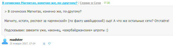 Ну вот, теперь пусть кто-нибудь скажет, что не читают Приветсочи, не слушаются советов и не мотают себе на ус. Начали мы говорить на Привете об армянско-швейцарском сыре — и вот он появился не только в Магните, но и по всему городу сегодня можно найти отличный «армянский» ДорБлю. Не успел я еще месяц назад посоветовать нашим предприимчивым гражданам завезти «азербайджанские» шпроты…