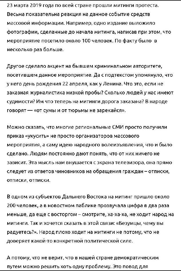 «Амурская область. Власти Благовещенска распространяют фэйки, чтобы не допустить проведения митинга на площади Ленина. Благовещенским коммунистам запретили проводить митинг 23 марта, сославшись на несуществующий ремонт центральной площади».