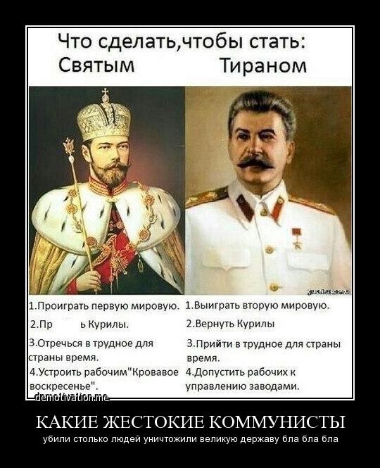 "… Царская Россия была благополучной, развитой и богатой страной. В стране было изобилие всего — продовольствие массово экспортировалось, кормили Европу. Цари были милосердны и мудры, особенно Николай Второй. Террористы подбивали добрый народ на бунты против власти. Ленин стремился к личной власти и был немецким шпионом. Большевики свергли царя. Они же развязали Гражданскую войну, выгнали за границу лучших людей России и погубили в ней 20 (или 40?) миллионов человек. Ограбили деревню, расстреляли 40 (или 80, или 110?) миллионов невинных людей. Еще 30 (40 — 50?) миллионов загубили во Второй мировой войне. Оккупировали Прибалтику, Польшу, Венгрию, Чехию и прочие страны (Кубу, Вьетнам, КНДР, Гренаду, видимо, и много еще других). Сталин — тиран и убийца. Коммуняки разорили страну и просрали СССР. Коммуняки стали олигархами. Коммуняки хотят вернуть СССР и ГУЛАГ. Коммуняки поссорились совсем миром, но хотят подчинить себе все страны..."