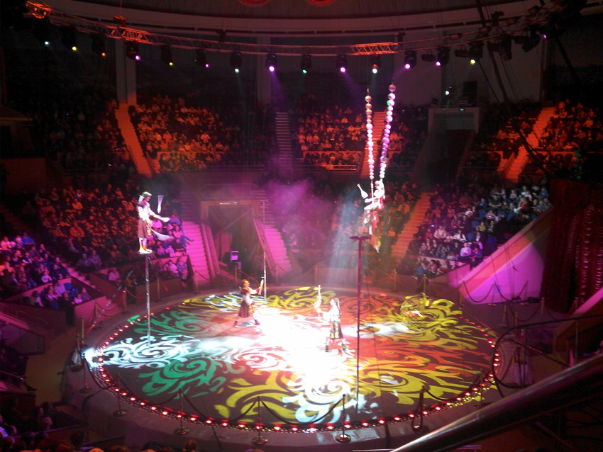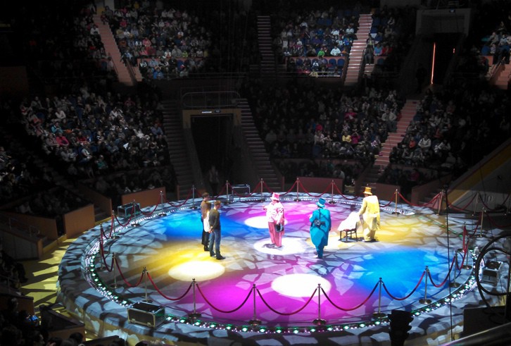 В лучших традициях театральной антрепризы, заполняющей сцену „Зимнего“, вместо первоклассного представления, нам было преподнесено жиденькое театрализованное цирковое представление. Сразу забудем про живой оркестр и шпрехшталмейстера — только фанера. Номера с масштабным оборудованием вычеркиваем, все артисты свой реквизит должны поместить в багажную норму эконом класса. То есть никаких слонов или хотя бы коней, только поросятки и мартышки, знакомые по набережной. Если жонглировать, то шляпами и одному. А бюджетный бык — собака в костюме быка с рогами вообще убила.