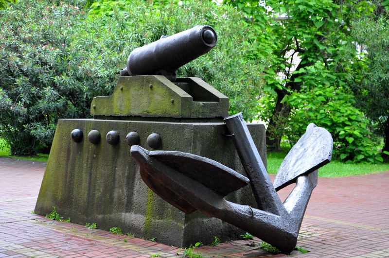 2. Монумент «Якорь и пушка». С 1913 года стоит у библиотеки им. Пушкина. Пушка отлита в 1809 году на Александровском заводе. У основания памятника установлен якорь, принадлежавший военному фрегату «Пендераклия», который потонул в 40-х гг. XIXв. около поселка Якорная щель