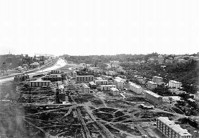 В 1954 году я в возрасте неполных пяти лет лечился в инфекционной больнице и наблюдал взлёт и посадку самолётов «кукурузников» (на этом месте был аэродром). Позже, примерно во время этой съёмки с пацанами лазили по этим стройкам. Грязи было по уши! Людей туда заселяли чуть ли не насильно и во многом благоустраивали они сами на субботниках, воскресниках и просто в свободное время. Когда в 1965 году я поступил в Сочинский Политехникум, уже была красота.