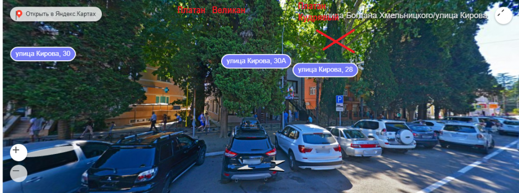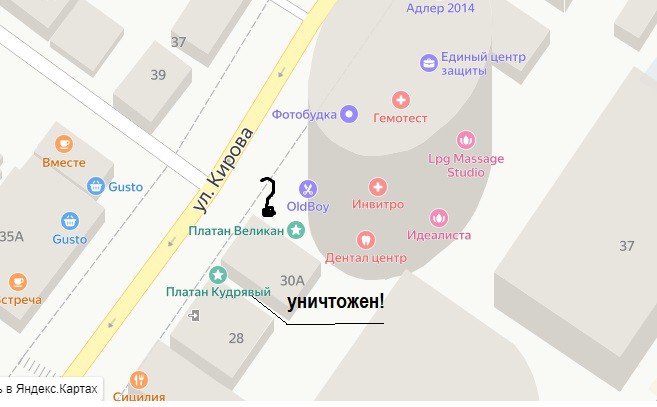 Памятник природы — «Платан Кудрявый», расположенный у входа в административное здание (ОКС 23:49:402030:2214), ул. Кирова, 30-а (земельный участок с кадастровым номером 23:49:402030:524, муниципальная собственность) уничтожен!