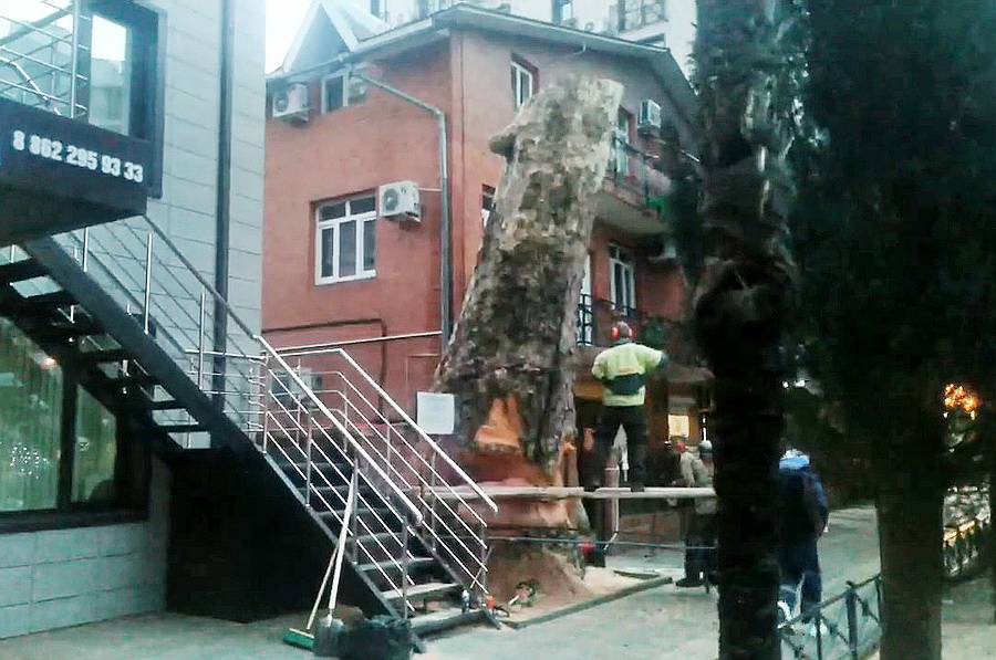 В самом центре Адлера на ул. Кирова напротив администрации района сейчас уничтожают прекрасное вековое дерево, платан восточный «кудрявый», являющийся памятником природы Краснодарского края и находящегося под охраной государства.