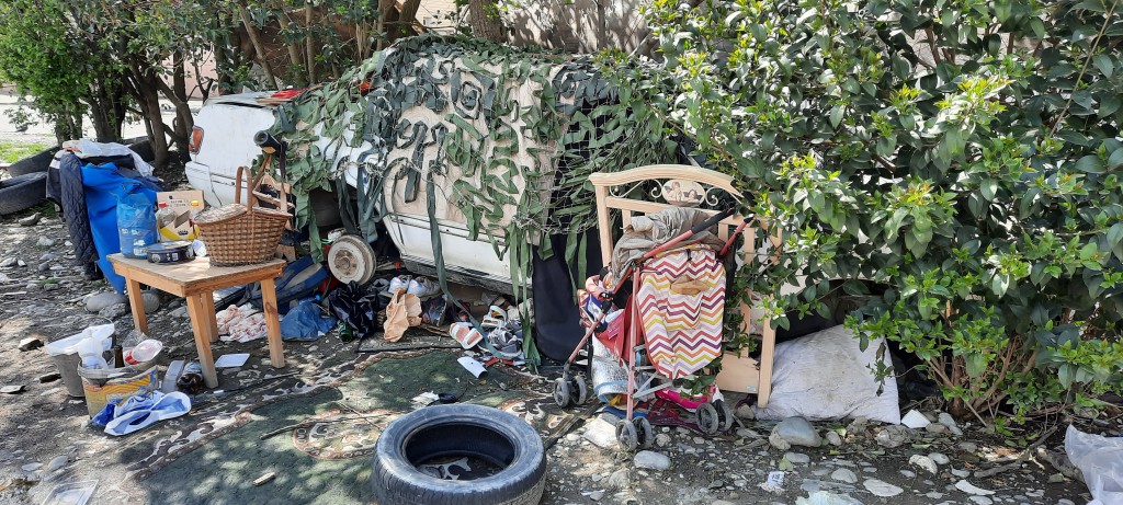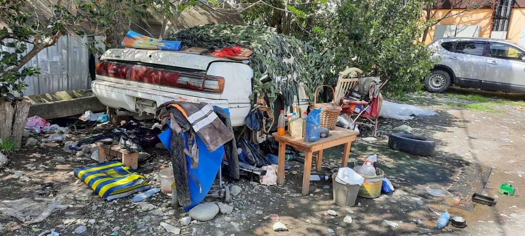 Снимки сделаны с интервалом в неделю. На машинку накинули маскировочную сетку и благоустраивают внутри. Не знаю для кого создаются удобства — для людей или собак, но любой из перечисленных вариантов не способствует приятному соседству.