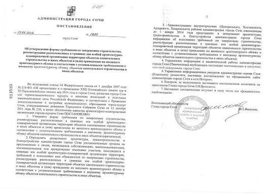 Постановление администрации города Сочи от 07.09.2012 г. №1920 «Об утверждении формы требования по завершению строительства, реконструкции расположенных в границах зон особой архитектурно-планировочной организации территории объектов капитального строительства и иных объектов и (или) привидению их внешнего архитектурного облика в соответствии с установленными требованиями к внешнему архитектурному облику объектов капитального строительства и иных объектовСсылка