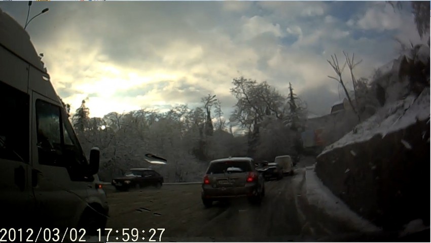 Сегодня, в 16.20 на наш город обрушился снежный буран, который продлился чуть более 2 часов. За это время на возвышенных районах города выпало снежных осадков по 20 см в высоту! За это время пострадало несколько человек и нанесен существенный материальный ущерб имуществу многих сочинцев. Особенно это коснулось тех, кого катаклизм застал в дороге, за рулем. Об этом я и хочу написать. Собственно, именно белый ад, по другому то, что происходило на наших дорогах с 16 часов вечера назвать нельзя. Но какой же ад без чертей? Вот и в нашем белом аду их было предостаточно! И я вам их покажу. Заранее извиняюсь за качество фото, поскольку они сделаны с видеозаписи моего бортового видеорегистратора, ибо рулить на летней резине по снегу и фотать одновременно не было никакой возможности.