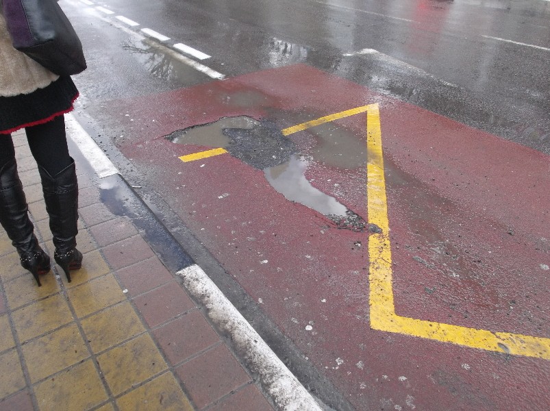 Идем дальше… На остановке Металлург нас ожидает новый сюрприз: небольшая яма напротив остановки. При попадании в эту, казалось бы небольшую лужу автомобиля все ожидающие маршрутку на остановке получают неприятный сюрприз. Ещё лучше, когда маршрутка подъезжает, все подходят к обочине и тут… неприятный сюрприз — мокрые и грязные брюки.