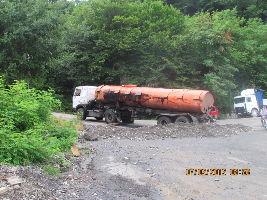 Только 1 июля улетел битумовоз… Около 40 тонн битума вылилось сначала на дорогу, потом ливнем всё смыло в Псахе… К счастью, эта машина никого не зацепила…