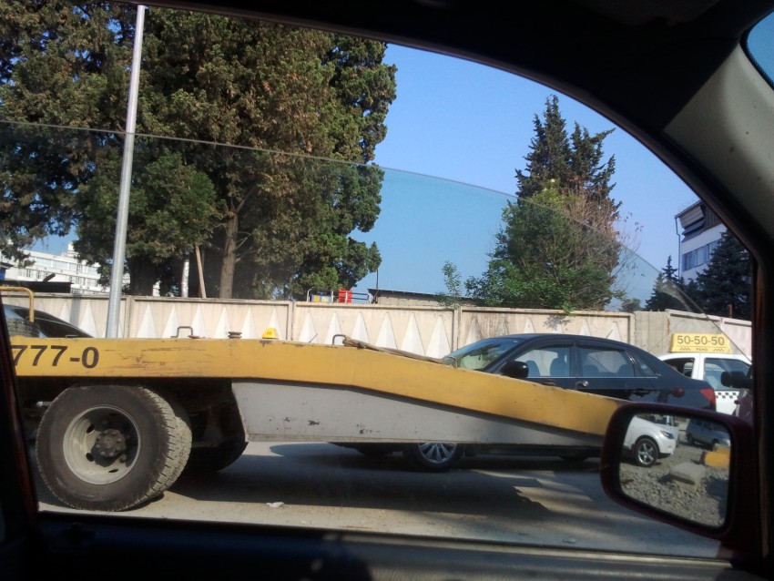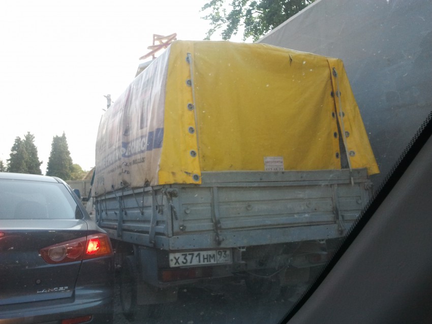Вид из машины справа(у обочины припаркована фура, а параллельно ей ещё и ГАзель)