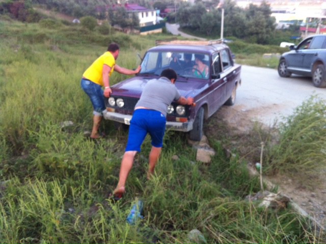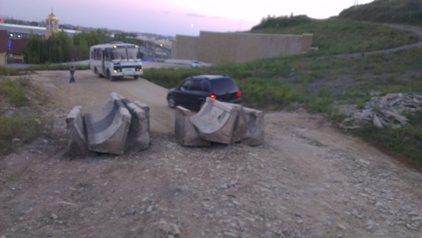 а люди чо, им ехать надо, прокляли распорядившегося и исполнившего, пожелали им импотенции, прикинули, сначала левее фесок — подложили камушки ликвидировав бетонную ступень опорной стеночки для съезда приехавших сверху в тупик…