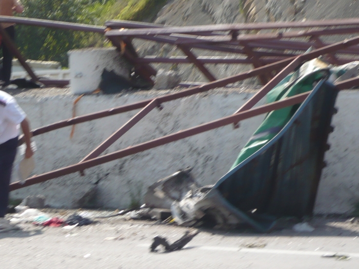 Только что вернулась из Сочи. Трасса от Мамайского поста ГИБДД в сторону Дагомыса забита до отказа и движется с минимальной скоростью… То же самое и из Дагомыса в город… Снова случилась авария, снова на самом опасно повороте при спуске с Мамайского перевала, снова очень страшная с участием грузового длинномера… Не прошло и недели с последней аварии, практически на том же месте. В прошлую пятницу у длинномера, везшего трубы большого диаметра, отказали по всей видимости тормоза, но водитель- молодец, отлично с ориентировался и заехал в аварийный карман… Трубы рассыпались по земле, страшно представить что случилось бы растеряйся водитель, сколько жертв удалось избежать… Пострадал только автомобиль «Жигули», который был (припаркован!), прямо в кармане… Автомобиль, превращенный в груду металла, восстановлению не подлежит… Сегодняшняя авария гораздо страшнее в последствиях… Длинномер, везший металлические конструкции, не вписался в последний, самый опасный поворот, перед спуском к посту ГИБДД. Бетонные ограждения, разделяющие полосы встречного движения, разрушены. Двигатель лежит на встречной полосе. По-моему есть жертвы, так как кабина водителя полностью смята. Извиняюсь за качество снимков, они сделаны из автомашины.