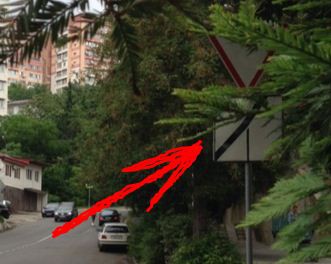 Мне снимают баллы за то, что я не показала правый поворот! А все дело в том, что знак, который прячется в кустах, показывает, что дорога здесь вовсе не прямая. Разумеется, ни один нормальный человек здесь не показывает поворот направо. Кстати, я проезжала этот же участок в предыдущий раз с другим гаишником, и он не требовал показывать поворот (а возможно и снял бы баллы за введение в заблуждение других участников движения)