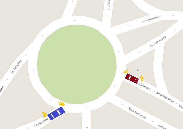 Ты синий и едешь дальше опять по Гагарина. Почему не показать — подсказать (а расстояние между пересечениями, на которых показаны автомобили, в реале гораздо меньше чем кажется на схеме) выезжающему с Московской, что пойдёшь по кольцу, а не свернёшь тоже на мост. Ведь трудно понять: то ли просто не включил поворотник (а по жизни такое сплошь и рядом), то ли, как уже говорил выше. И если учесть сказанное в скобках придётся ждать, пока не убедишься что точно не помещаешь синему.