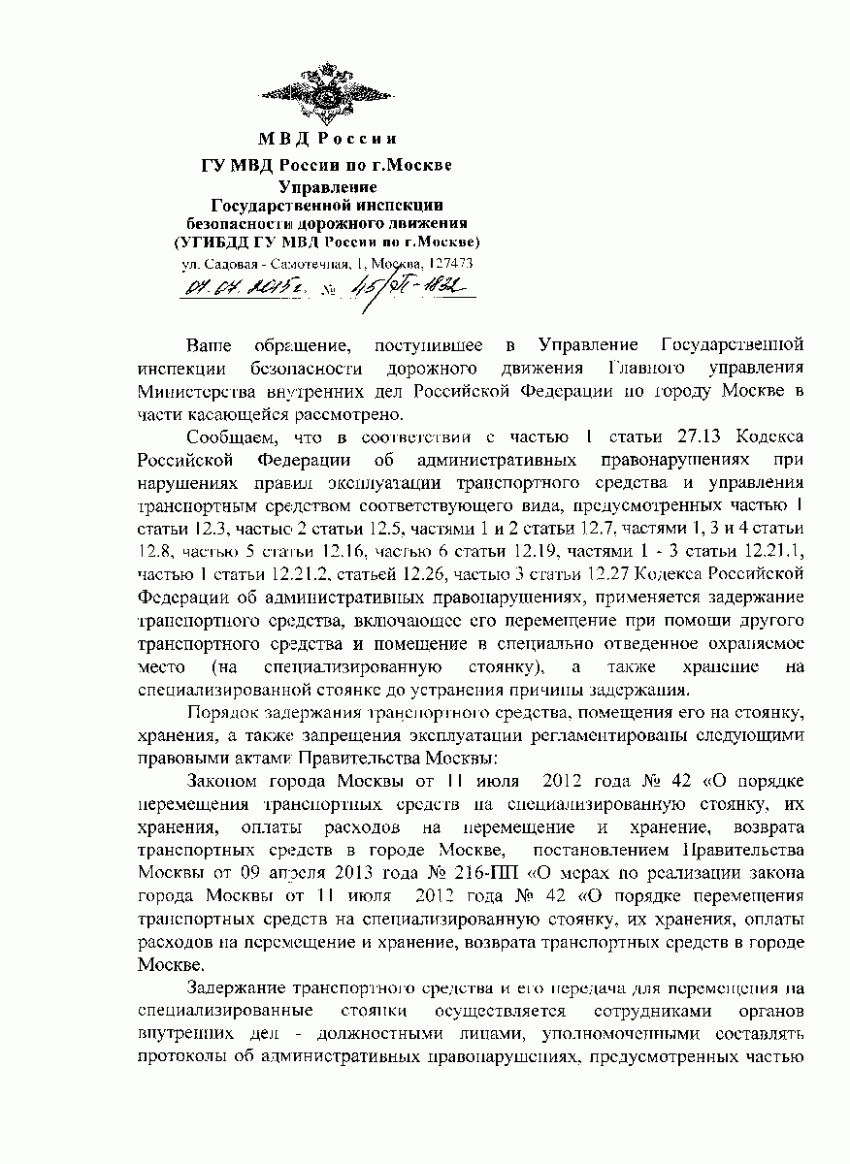 Когда этот закон, якобы «ограничивающий» эвакуаторный беспредел, еще только готовились принимать, написал в госдуру, правительство и президенту что в нынешнем виде данный закон ничего не изменит — под каждым 3.27 развесят 8.24, и все дела. Эвакуация должна производиться только в случае, если ТС реально создает помехи для движения — собственно, для чего принудительная эвакуация и была придумана, а вовсе не как карательная мера. Просьба скорректировать закон соответствующим образом, чтобы применение принудительной эвакуации было разрешено только в случае, если ТС реально создает помехи движению. В ответ получил лишь вот такую абсолютно бестолковую отписку: