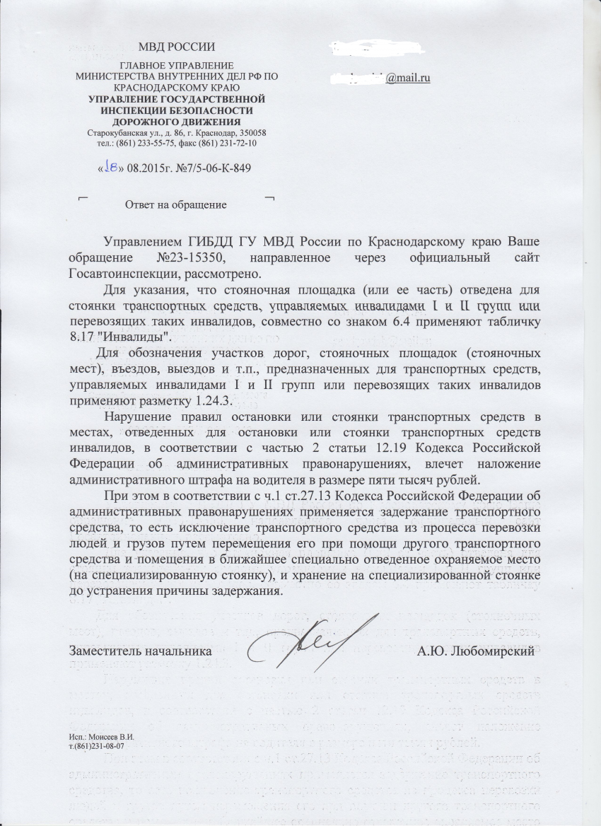 И по прошествии, надо отметить совсем непродолжительного времени — я получил ответ, который и выкладываю на ваше обозрение. Тем самым мы сможем подвести своего-рода черту под ветвью обсуждения в весьма «нашумевшем» блоге, посвящённом парковке на местах предназначенных для инвалидов.