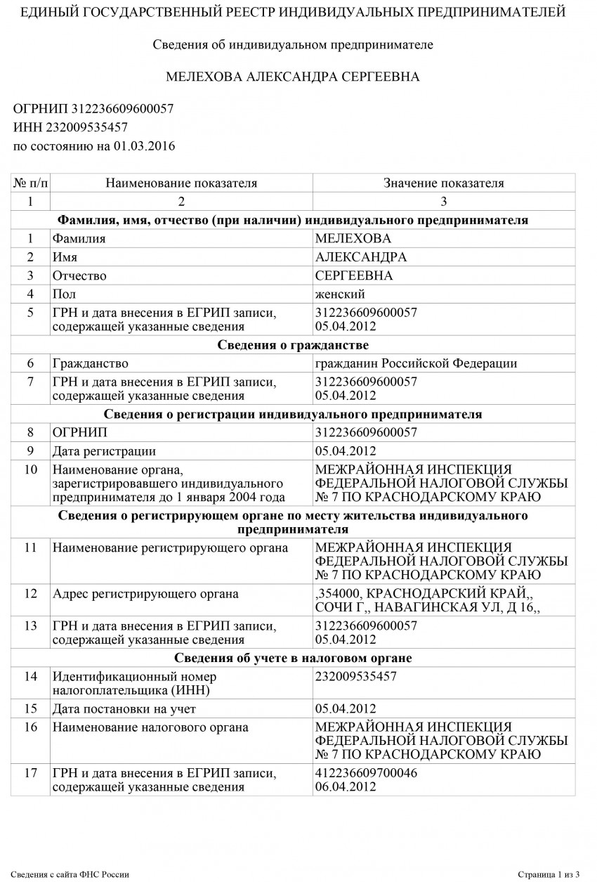 — копией свидетельства о постановке на налоговой учет ИП Мелиховой А.С.