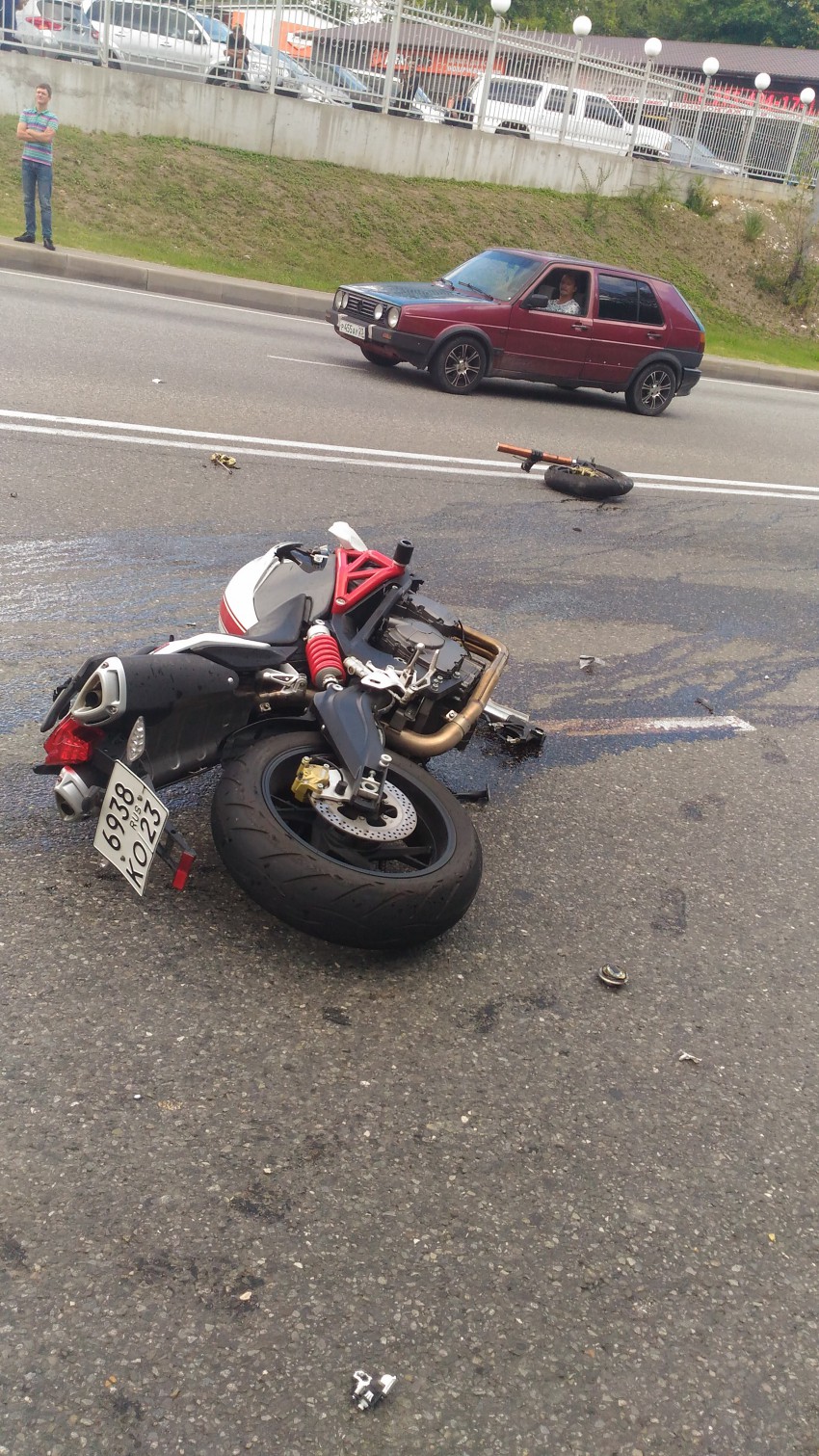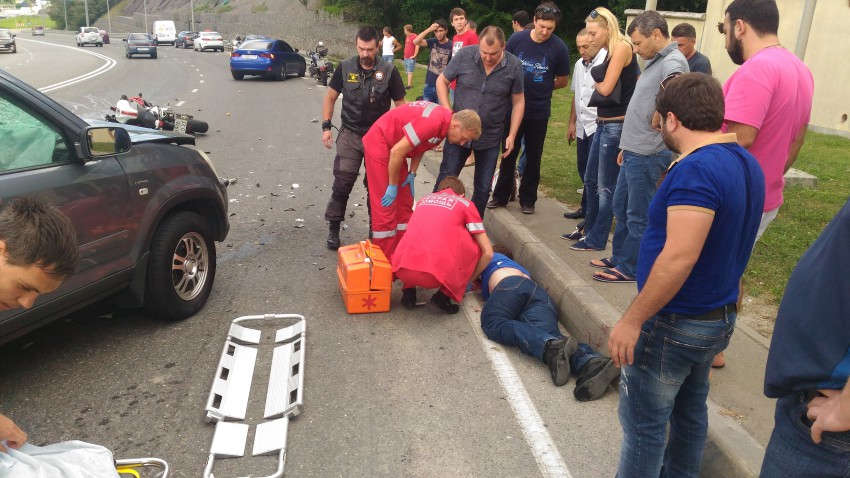 Байк на встречку вылетел. Да, скорость у него была приличная. Слава Богу сам жив остался, но в больнице месяца 2 точно пробудет. Ему очень сильно повезло.