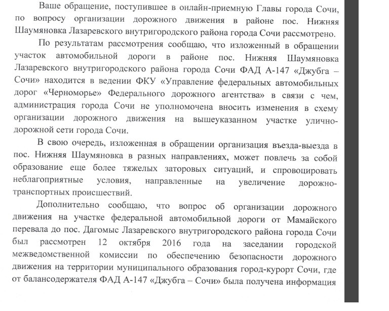 Думаю назрела необходимость создать коллективное послание жителей поселков Нижняя Шаумяновка, Дагомыса и всех заинтересованных в решении этой проблемы в администрацию города. Дубль в администрацию края и в администрацию президента. Иначе это с мертвой точки не сдвинется. Все уже считают что население смирилось с сложившейся ситуацией.
