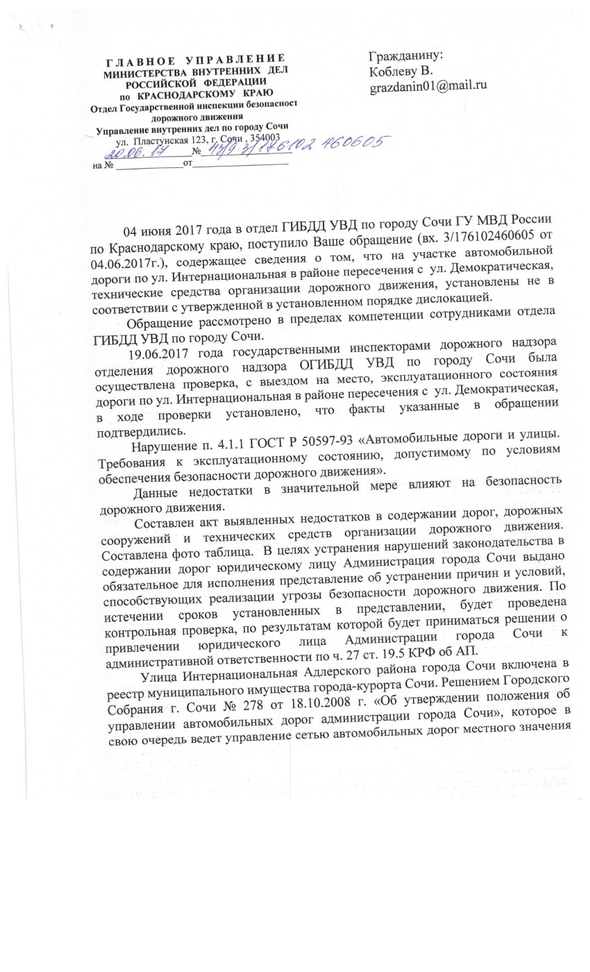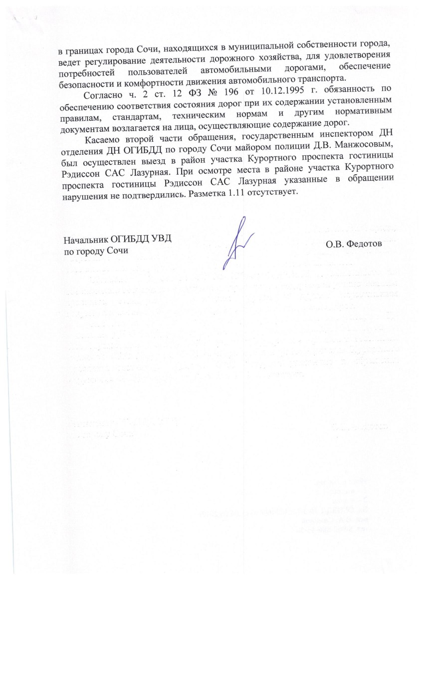 Конечно, мое обращение не осталось без ответа. Заместитель начальника ГИБДД Сочи ответил так: