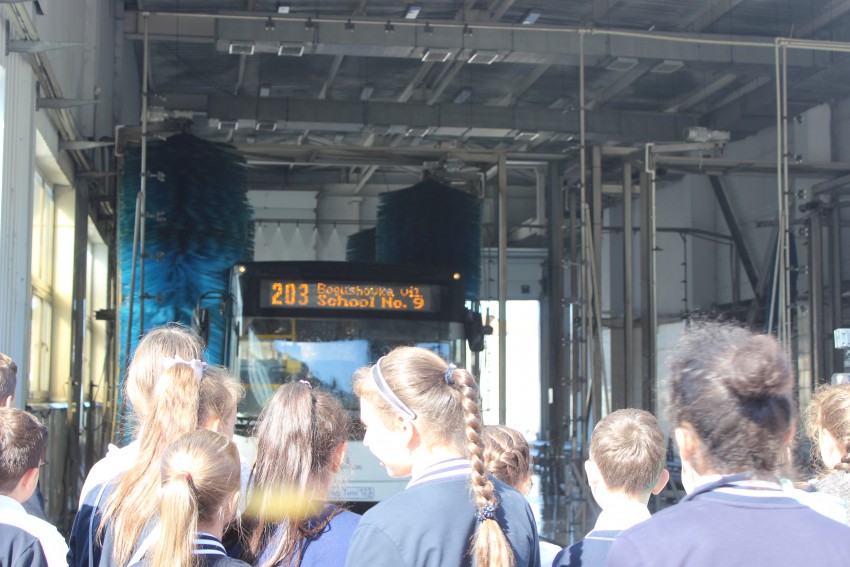 Впечатлила пятиклассников и мойка автобусов, на которую они посмотрели «изнутри». Радость, неописуемые эмоции и счастливый смех не затихал на протяжении всего процесса! На таком аттракционе они прокатились впервые. Затем ребята сами расклеили свои рисунки в автобусах, после чего мы их пригласили на сладкий стол в столовую.