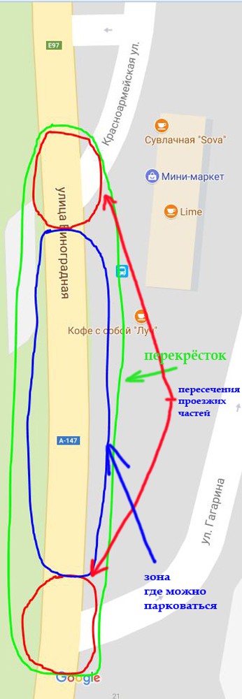 Зелёным подписан перекрёсток. Красные, как видим, пресечения, грубо с 5-ти метровыми зазорами. На остальной площади перекрёстка (сейчас опустим прочие запреты, чтобы не отвлекаться, берём чистый вариант) можно парковаться — на перекрёстке.