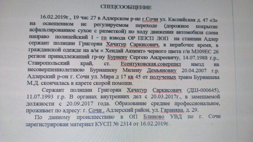 Вечером 16 февраля 26-летний полицейский ППС линейного отдела полиции на станции Адлер Сочинского ЛуВДТ двигался на своем автомобиле Hyundai Accent по улице Каспийской в Адлерском районе. Водитель, приближаясь к остановке общественного транспорта, не снизил скорость и не уступил дорогу 10-летней девочке, переходящей проезжую часть по нерегулируемому пешеходному переходу. В результате водитель допустил наезд на ребенка, девочка была доставлена в больницу, где скончалась. После ДТП мужчина с места происшествия скрылся, позже подозреваемый самостоятельно явился в правоохранительные органы", — говорится в сообщении.