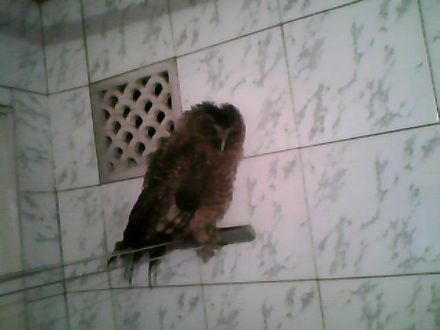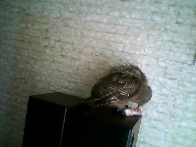 Мкр.Бытха 13.06.2011 в 5.45 утра, меня разбудила птичья трескотня. Оказывается виной всему, совенок. Этот бедняга забился в уголок и как мог, отбивался. То щелкал (специфический звук) клювом или может это не клюв, сложно разобрать, то пищал как птенец… Жалко стало мальца. Разогнал птиц, сбегал домой за крагами и стулом. Попытался достать его, фиг. Тот вспархнул, но далеко улететь не смог, мал ещё. Упал в кусты, там я его и подобрал. Сам весь целый, никаких дефектов не заметил. Испуган сильно. Пока писал, тот в ванне пообвыкся, меня меньше стал бояться. Накормил его курочкой))) Перенес в комнату, он сразу нагадил на пол))) Теперь сидит на колонке и засыпает )))