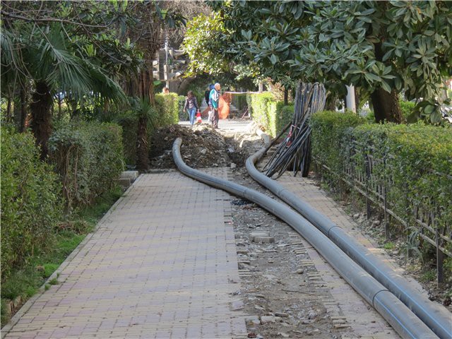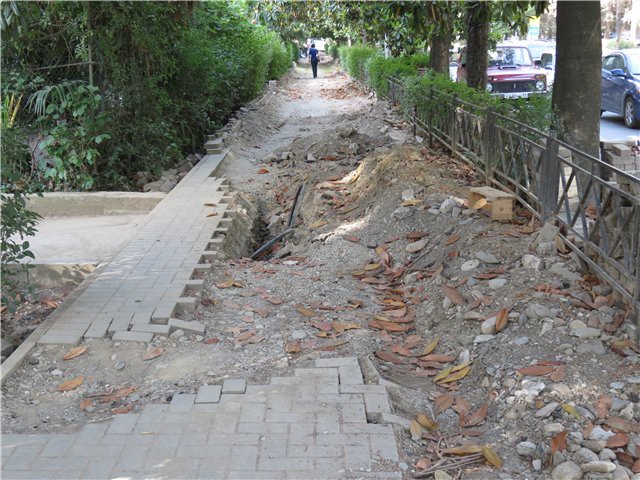 Засохшие кусты, тротуары, на Красноармейской по четной стороне половину тротуаров надо переделывать (энергетики не при чем), ковыряются два гастрика — меняют по одной плитке.