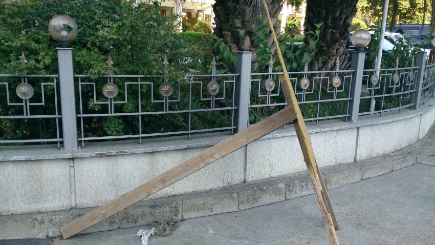 Установлен в районе Кубанского кольца около въезда на стоянку отеля «Звездный». Предлагаю голосование на тему, что хотел выразить художник по отношению к Цветному бульвару нижней фигурой.