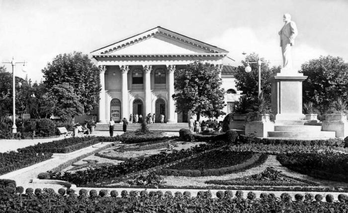 То же место, но лет 50 назад. Жаль, что черно-белое, но цветы на клумбах видно.