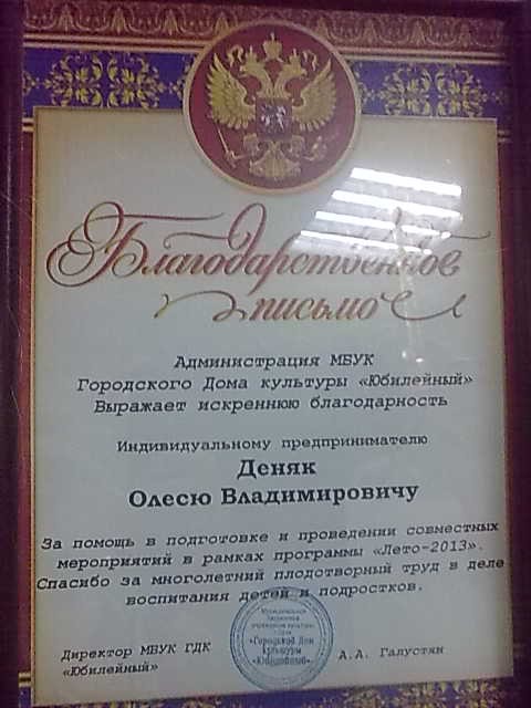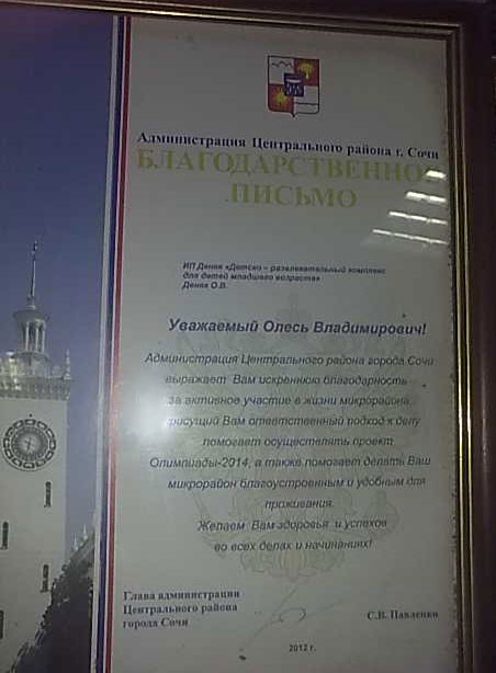 От себя лично и от сознательных граждан нашего дома №94 приношу извинения Деньяку Олесю Владимировичу, владельцу павильона детских аттракционов за, на мой (и не только мой) личный взгляд, не правильные и не целесообразные действия одной отдельной личности, проживающей в нашем доме и добившейся судебного постановления о демонтаже уже установленного павильона детских аттракционов.