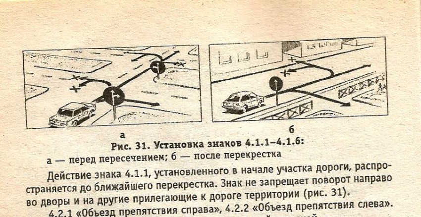 Действие знака 4.1.1, установленного в начале участка дороги, распространяется до ближайшего перекрестка. Знак не запрещает поворот направо во дворы и на другие прилегающие к дороге территории.