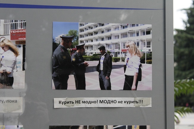 На знаменитой Доске позора на Торговой галерее наши власти вывесили очередные фотографии позора сочинцев.Оказывается в борьбу за здоровье горожан активно взялась милиция и пошла в массы в месте с активистами правящей партии доходчиво, объяснять все прелести антитабачной хартии.