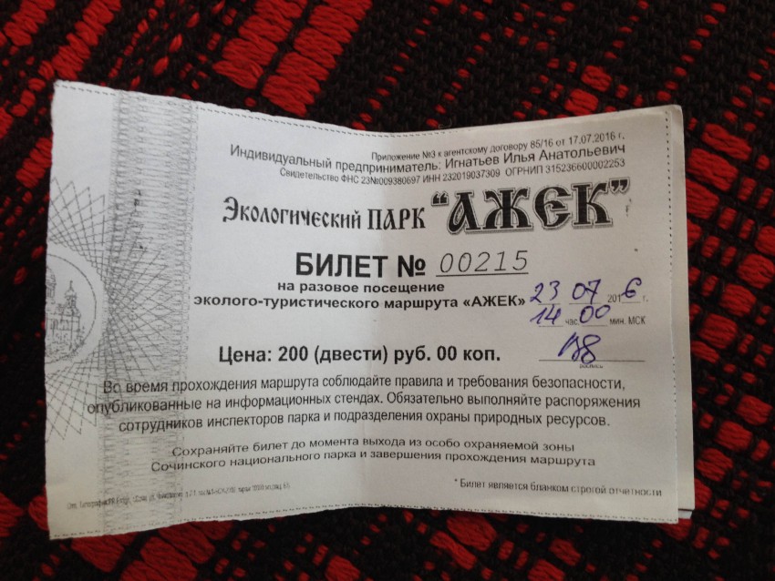 По словам этих людей, взымать плату необходимо для уборки мусора, так как САХ это место не обслуживает, а нерадивые отдыхающие оставляют на своём пути горы отходов. Стоимость входа — 200 рублей с человека. Но, один из бравых защитников природы сказал, что они «идут на встречу людям», и предложил для группы из 4 человек купить два билета. Попытки людей объяснить, что они просто проходят здесь идя на пасику успеха не имели, деньги с них всё равно взяли.