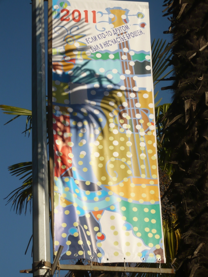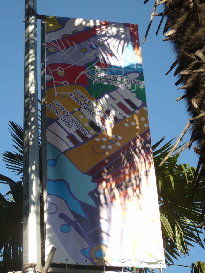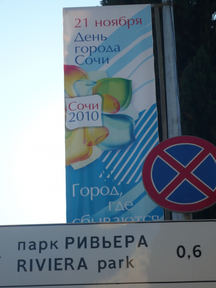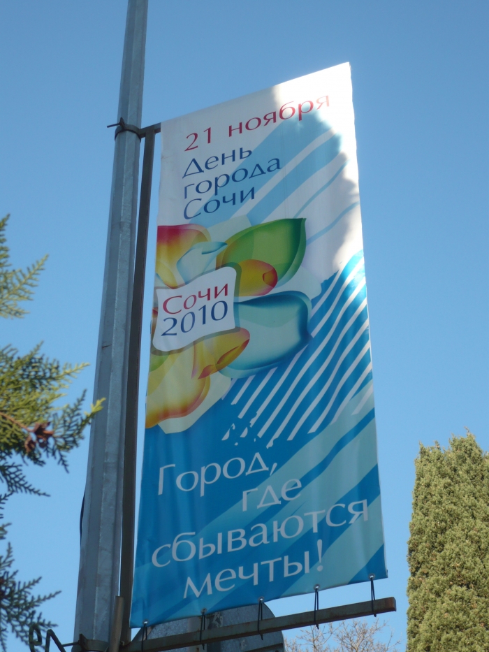 В Сочи — лучше бы побольше цветущих многолетних растений… А все растяжки и баннеры, только за счет рекламодателей, со строгим отбором по стилю… Здесь сама природа (если ее не гробить) украсит все что хочешь…